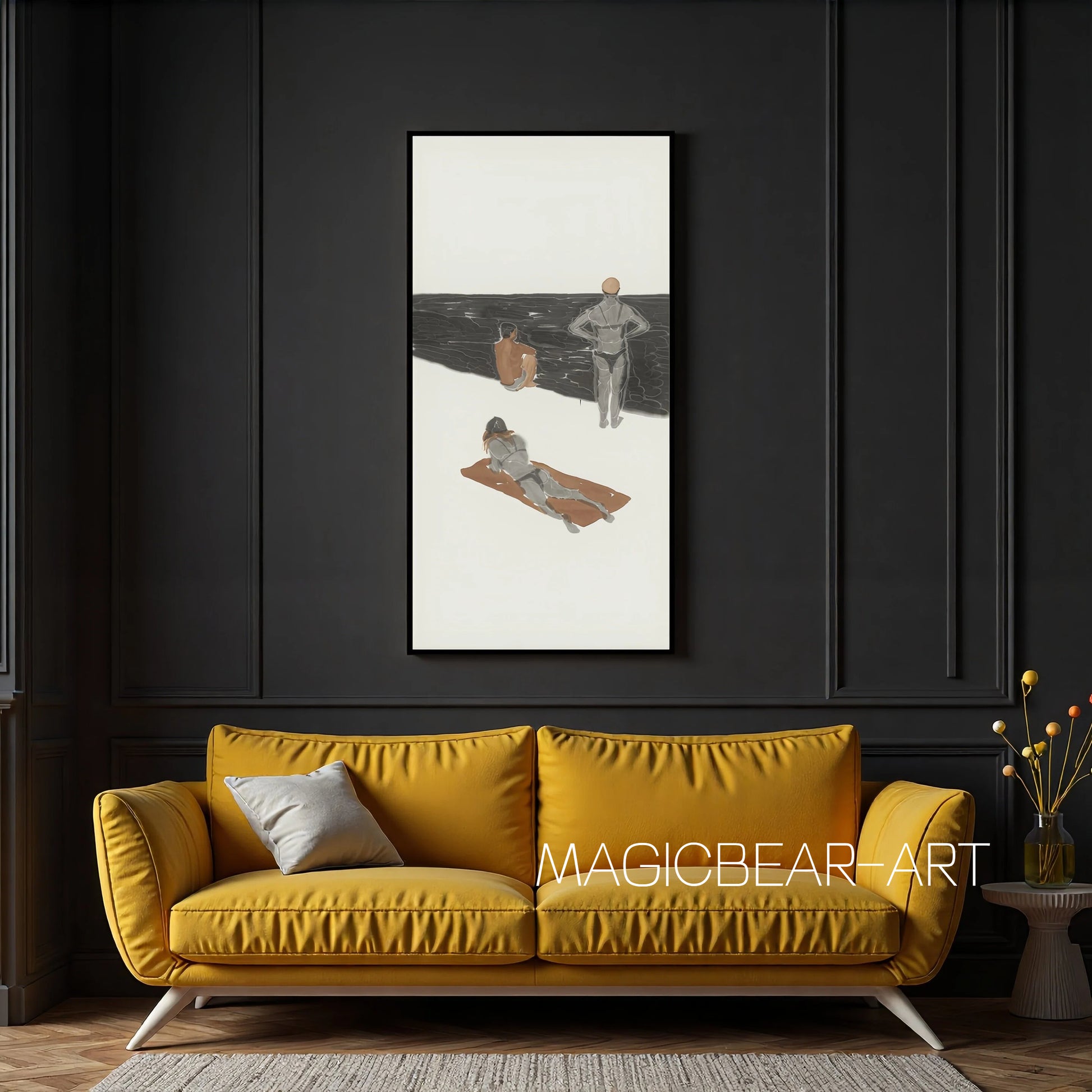 The three figures, each with distinct postures, share a silent moment facing the same sea, as if engaged in a quiet, inner dialogue. The sea is not merely a natural scene; it becomes a boundary of consciousness, a reflection of the mind.