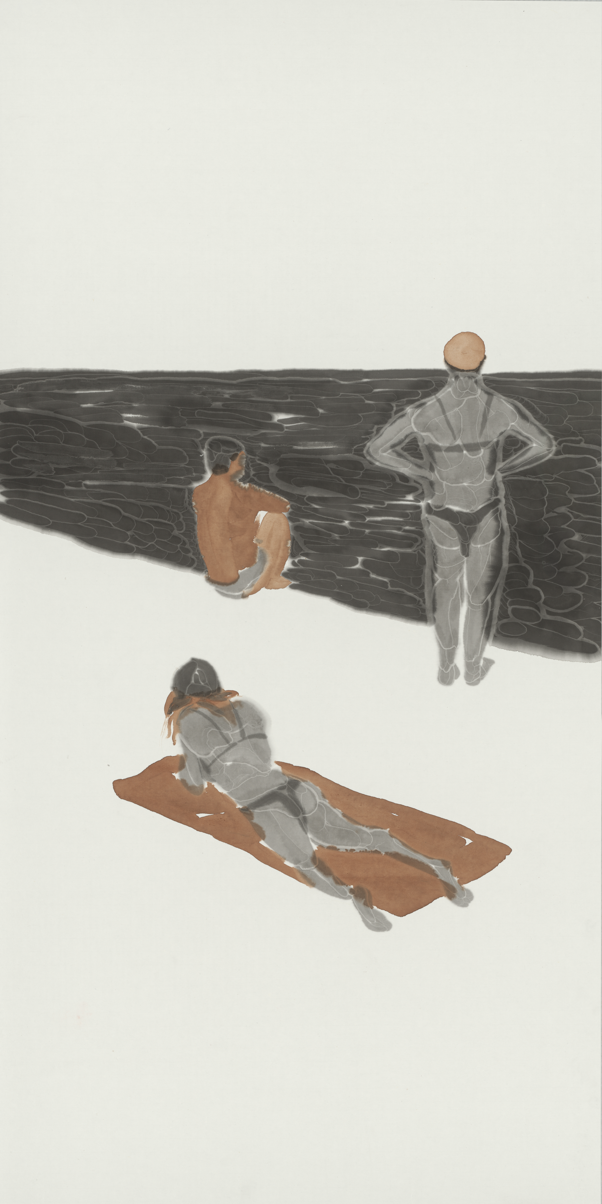“Looking at the Sea” depicts three figures gazing toward the ocean, using a composition rich in symbolism and intentional blank space. With calm and precise brushwork, the artist positions the figures within a vast negative space, naturally directing the viewer’s attention to the tension between “seeing” and “being seen.” This concise yet restrained visual language demonstrates his exceptional control over spatial sense and narrative rhythm.