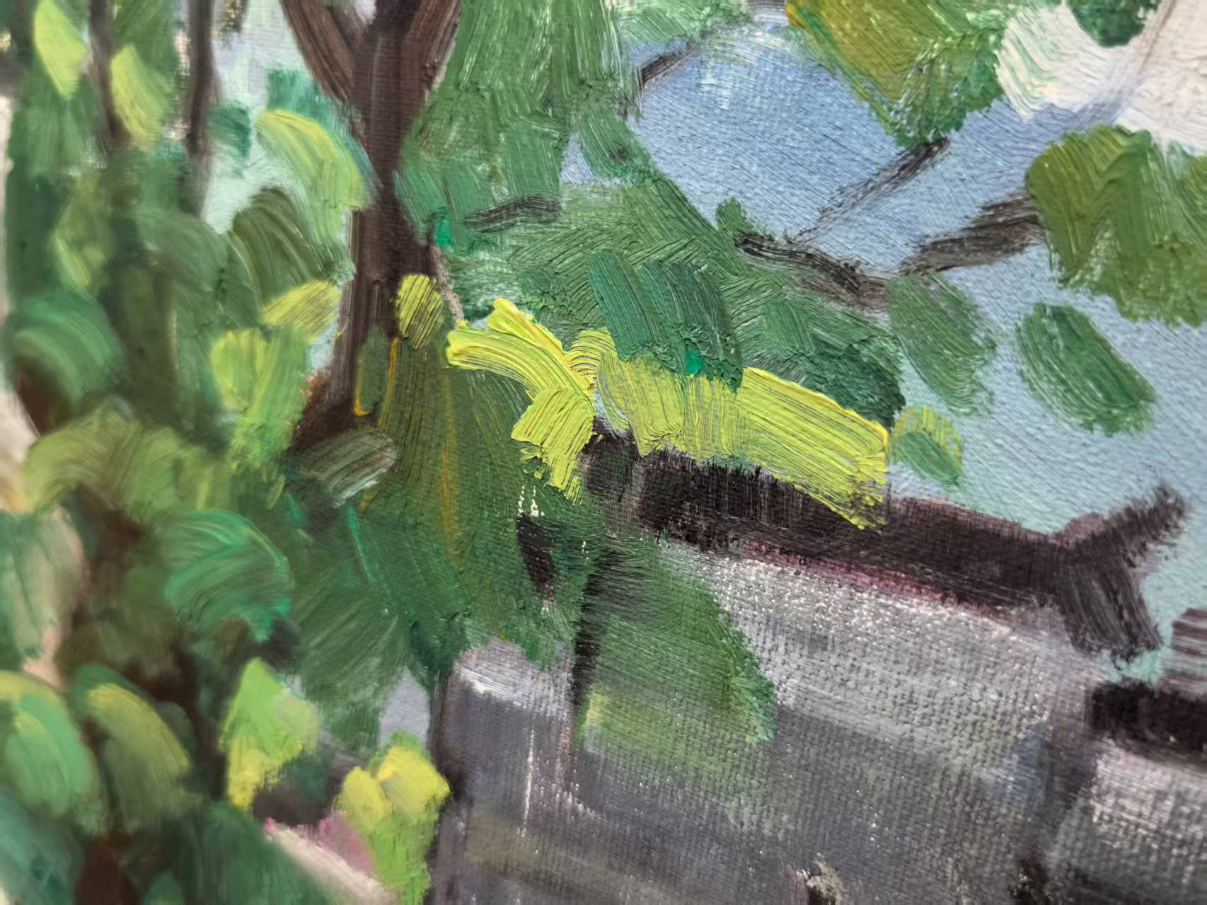 Hometown Rooflines.  Bring the timeless charm of a Chinese water town into your home with this one-of-a-kind original oil painting. Painted by a MAGICBEAR-ART contracted artist, this work captures the peaceful beauty of Suzhou-style architecture, winding waterways, and lush greenery, rendered in expressive brushstrokes and natural tones.