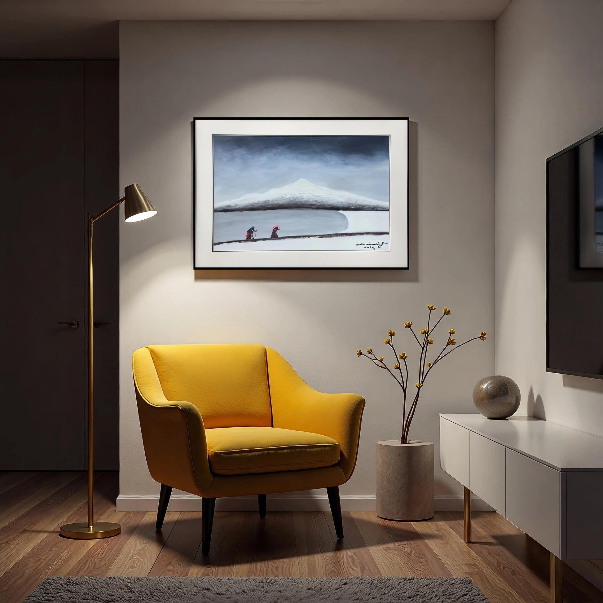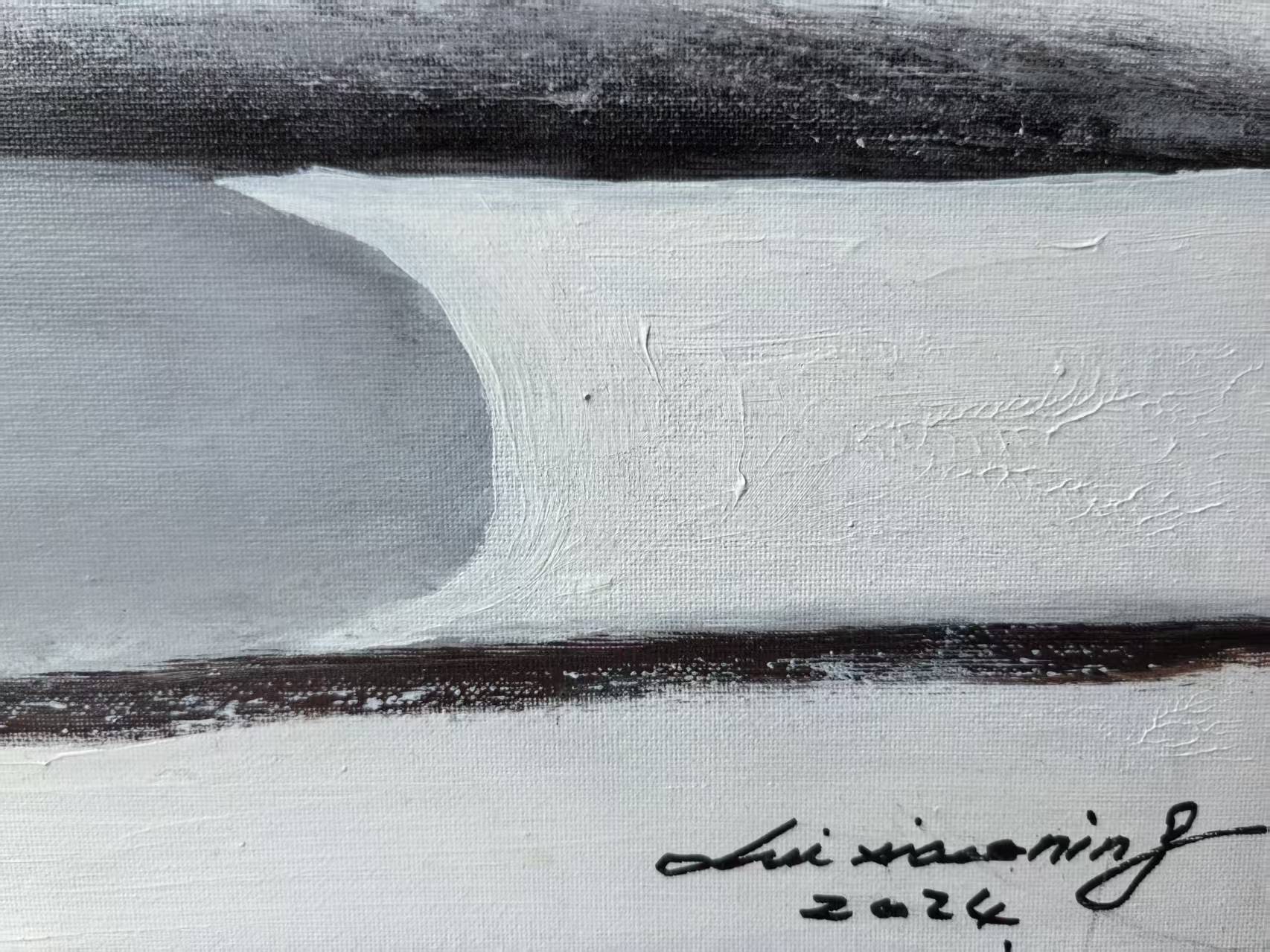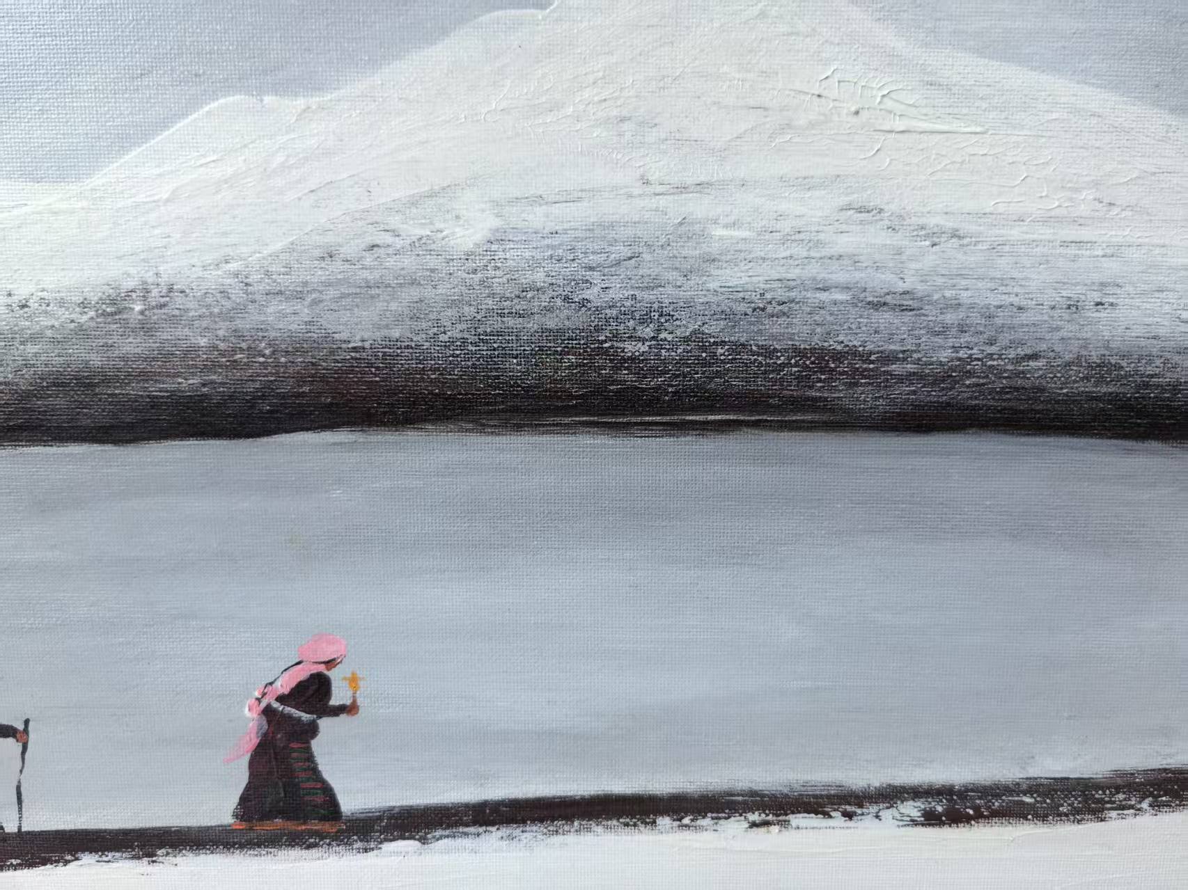 Titled The Pilgrims, this painting is a powerful, yet contemplative, centerpiece from Liu Xiaoning's "The Gaze Upon Tibet" series. It captures two figures immersed in the sublime silence of the Tibetan snowscape. They follow a singular, dark path that cuts across the vast expanse, embodying the unwavering devotion and spiritual resilience of the Tibetan people. The work's stark simplicity and powerful contrast between light and dark transform the physical journey into a profound metaphor for the journey of conviction.