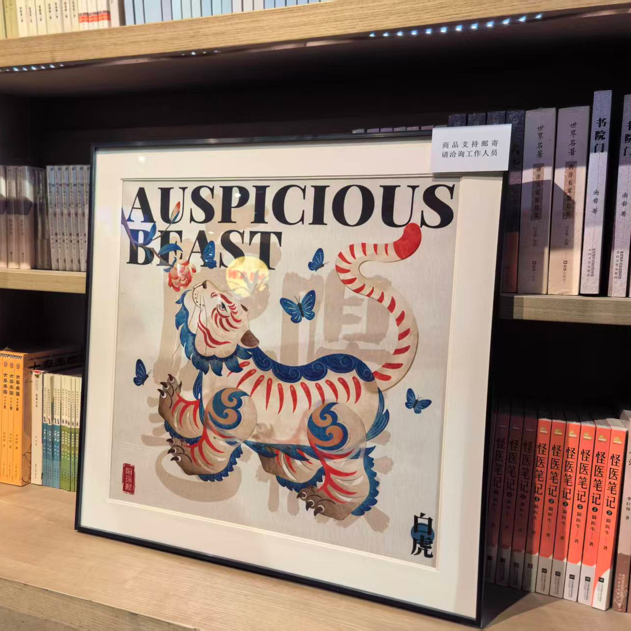 Background calligraphy of “白虎” (White Tiger) and the seal “瑞兽图鉴” (Illustrated Record of Auspicious Beasts) weave traditional language into a contemporary design;